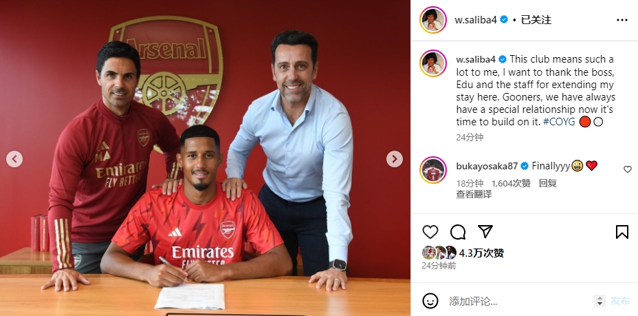 萨利巴写道:这家俱乐部对我来说意义重大,我要感谢boss、埃杜和工作人员,是他们延长了我在这里的时间。枪迷们,我们一直有着特殊的联系,现在是时候进一步发展它了。#COYG🔴⚪