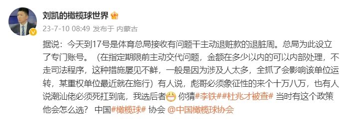 据媒体人刘凯透露,从今天到17号是体育总局接收有问题主动退赃款的退赃周,总局为此设立了专门账号。