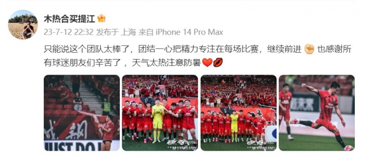 买提江在个人微博中晒出了海港队的合影,并写道:只能说这个团队太棒了,团结一心把精力专注在每场比赛,继续前进。也感谢所有球迷朋友们辛苦了,天气太热注意防暑。