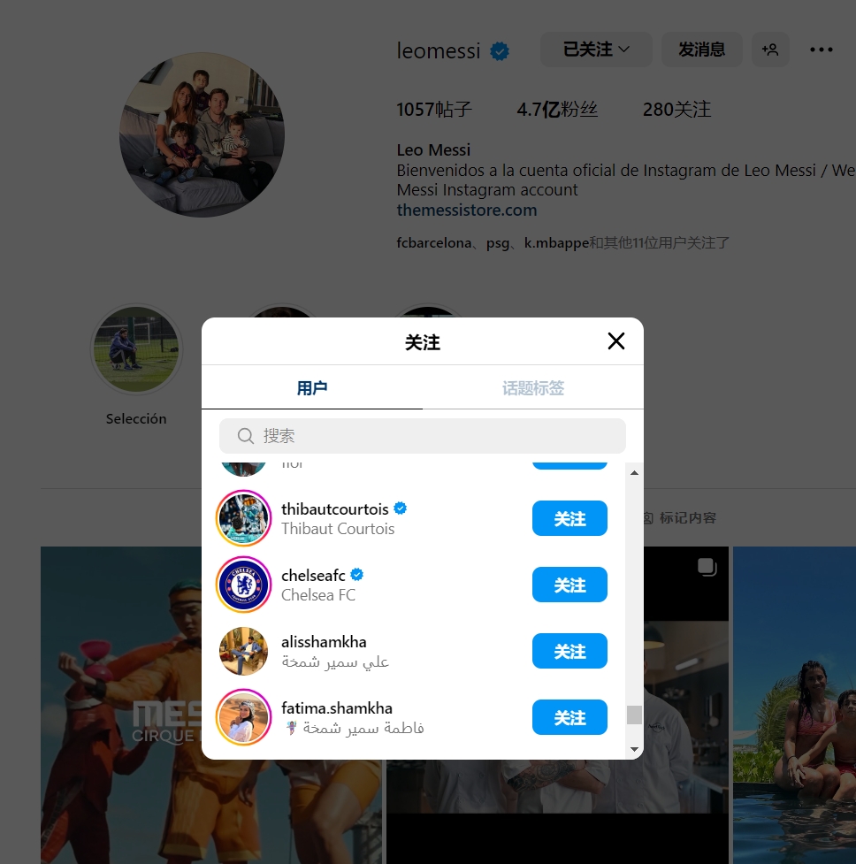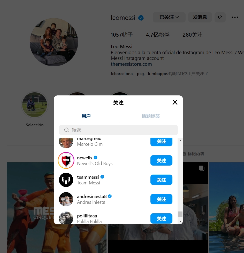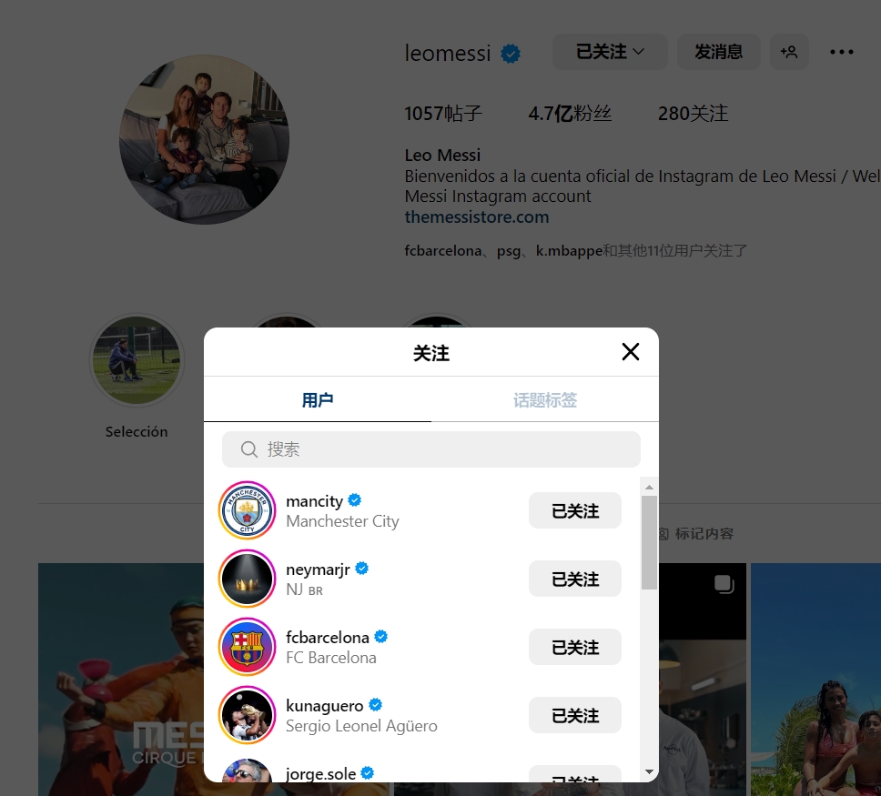 梅西目前个人INS关注列表中有280个账户,其中四个账户是球队官方账号,这四支受到梅西关注的球队分别是巴萨、曼城、切尔西以及纽维尔老男孩。