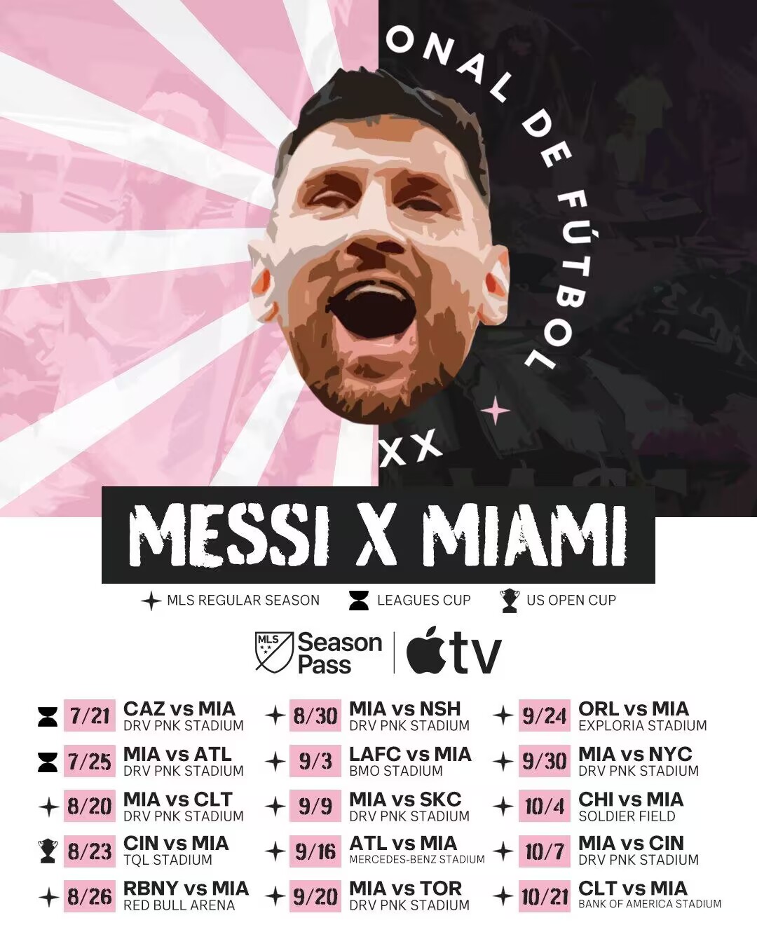 直播吧7月17日讯 苹果TV赛程确认,梅西将在北京时间7月22日早8点迈阿密国际vs蓝十字的比赛中首秀!