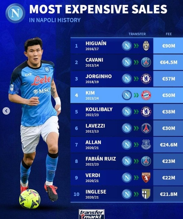 直播吧7月19日讯 拜仁已经官宣签下那不勒斯中卫金玟哉,《转会市场》统计显示后者也是那不勒斯队史出售的第4贵球员。