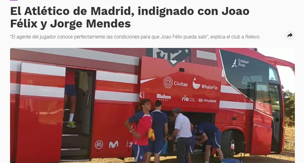 Relevo表示,马竞方面没有人预料到菲利克斯发表这样的言论,俱乐部没有对此进行授权,而他们也将愤怒之情同时迁怒到经纪人门德斯身上。