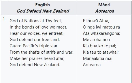 新西兰的国歌《天佑新西兰》(God Defend New Zealand)也在1987年谱写了毛利语歌词。根据新西兰的习惯,唱国歌之时会先唱毛利语版本,然后才唱英语版本。