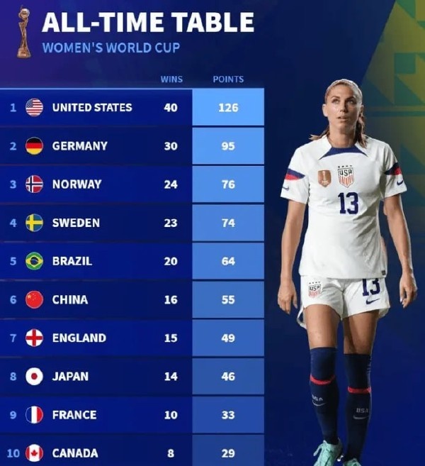 从世界杯历史积分榜看,赢下40场比赛的美国女足一共拿到126分,也是唯一积分破百的球队,甚至从第6名起,被美国女足甩开一倍以上的积分。