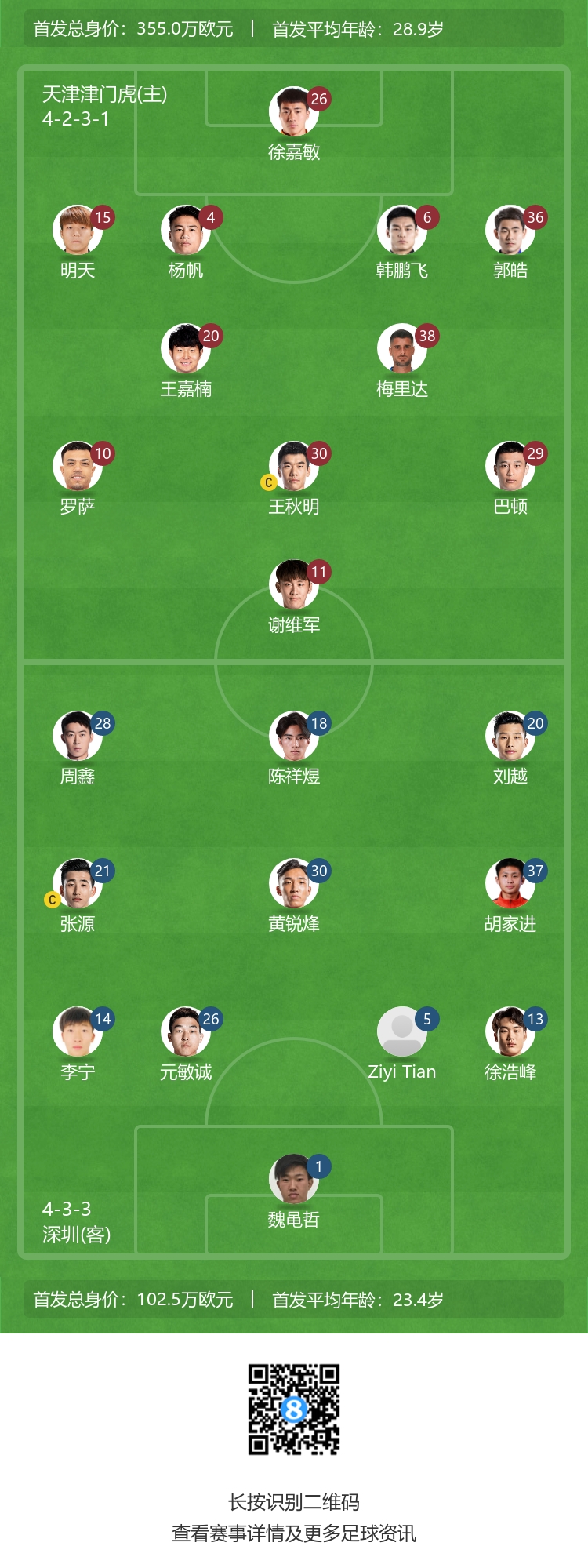 直播吧7月21日讯 北京时间19点35分,中超第18轮,天津津门虎主场迎战深圳队。赛前,双方公布首发名单。