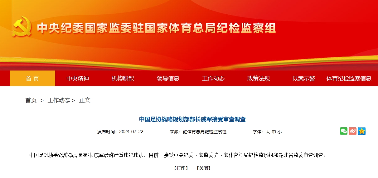 直播吧7月22日讯 驻国家体育总局纪检监察组消息,中国足协战略规划部部长戚军接受审查调查。