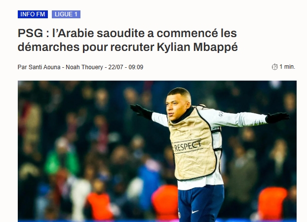 Santi Aouna表示在招募梅西失败后,沙特政府准备为姆巴佩准备一份巨额报价,让其加盟利雅得新月。