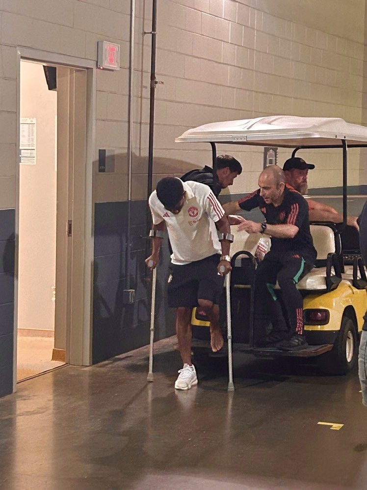 此前的一场季前赛中,曼联2-0击败阿森纳。在这场比赛中曼联球员阿玛德-迪亚洛受伤,赛后他被拍到拄拐离开了球场 。
