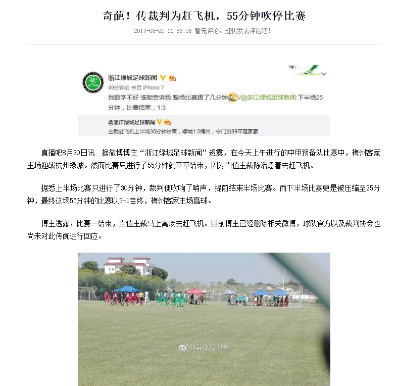 执法本场比赛的裁判陈浩被网友扒出,多年前吹罚杭州绿城vs梅州客家的中甲预备队比赛时“赶飞机55分钟吹停比赛”。