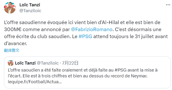 队报记者写道:“罗马诺提到的沙特报价确实来自利雅得新月,转会费为3亿欧元,现在是正式报价。巴黎仍在等待7月31日截止日的到来。”
