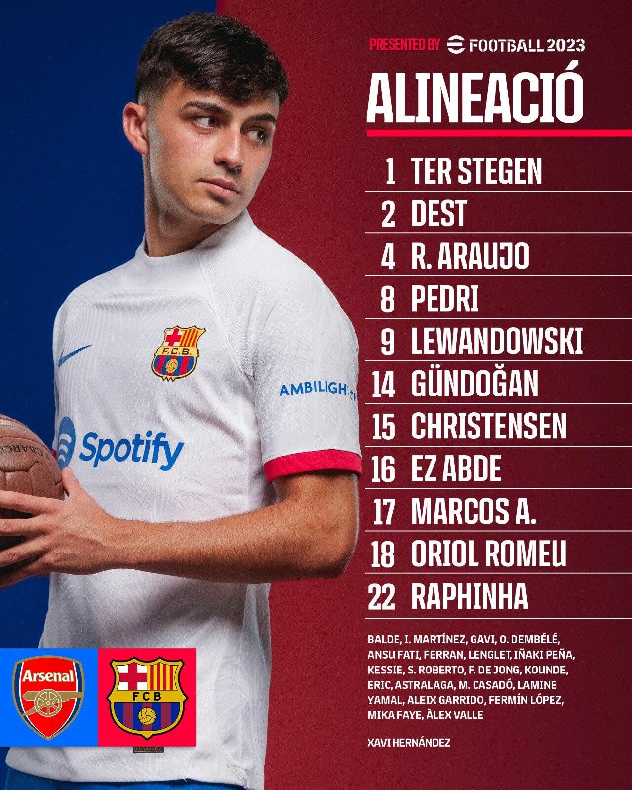 巴萨首发:1-特尔施特根、2-德斯特、4-阿劳霍、8-佩德里、9-莱万、14-京多安、15-克里斯滕森、16-阿布德、17-马科斯-阿隆索、18-罗梅乌、22-拉菲尼亚