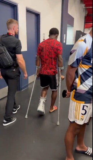 直播吧7月27日讯 在今天曼联和皇马的友谊赛后,曼联小将梅努穿着脚部护具并拄拐离开球场。