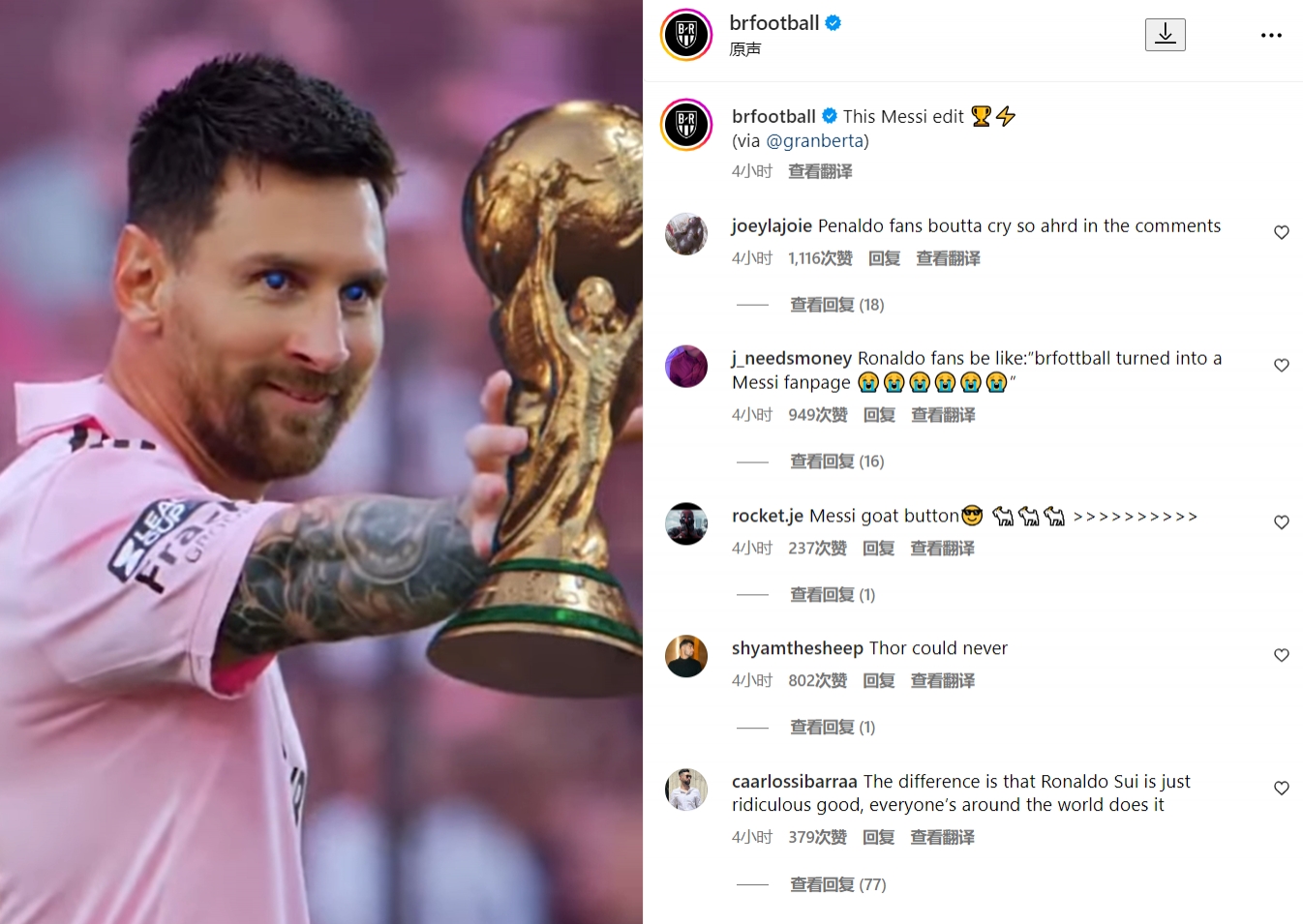 今日B/R football在社媒上发布了梅西的特效视频,视频中梅西目光如炬,右手伸出,“施法”过后大力神杯飞入手中。