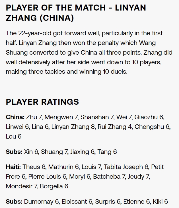 欧洲体育对张琳艳的评语:这位22岁的年轻人向前做得很好,尤其是上半场。她赢得的点球,最终帮助中国队取得了三分。张琳艳在球队10人应战时,在防守方面也做得很好,完成了3次铲抢,赢得了10次对抗。