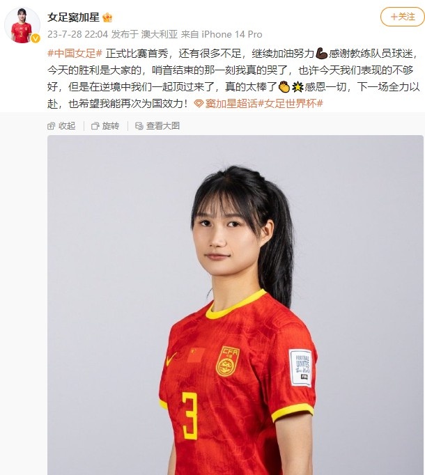 直播吧7月28日讯 中国女足在世界杯小组赛第二场1-0击败海地,本场比赛中国女足球员窦加星替补登场,赛后球员发文庆祝胜利。