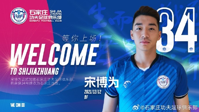 #功夫足球生而无畏战至终章# 经与山东泰山足球俱乐部、球员本人协商一致,球员宋博为租借石家庄功夫足球俱乐部。宋博为将身穿34号球衣为石家庄而战。宋博为在场上司职边后卫,2001年12月12日出生,曾经效力于山东泰山、济南兴洲。欢迎宋博为加入石家庄功夫足球队。