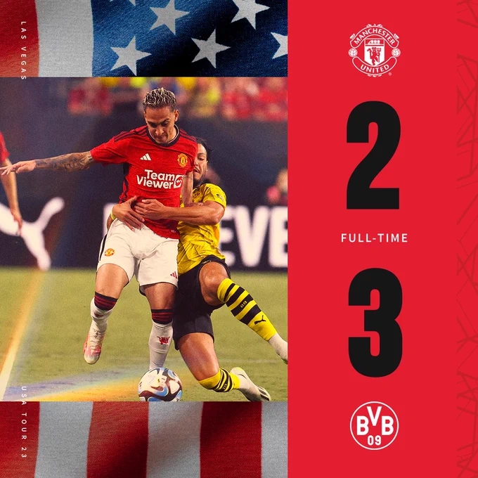 直播吧7月31日讯 北京时间7月31日09:00,足球友谊赛曼联迎战多特的比赛,上半场范德贝克助攻达洛特世界波破门,马伦一分钟内连进两球逆转,半场结束,曼联1-2多特蒙德。下半场安东尼推射扳平比分,穆科科替补建功,最终曼联2-3不敌多特。