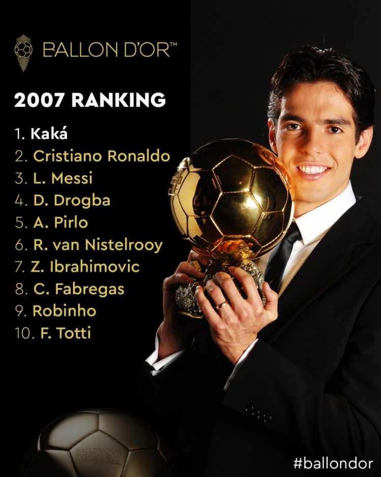 直播吧8月2日讯 金球奖官方回顾2007年的排名,卡卡获奖,C罗、梅西排名二三位。