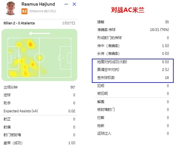 从统计数据可以看到,霍伊伦在亚特兰大和丹麦国家队的射门次数差了一倍。