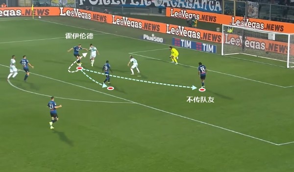 霍伊伦这一次反击中带球第一下过人极为漂亮,不过他后续没有传给顺下的队友,自己强行射门就不大聪明了。