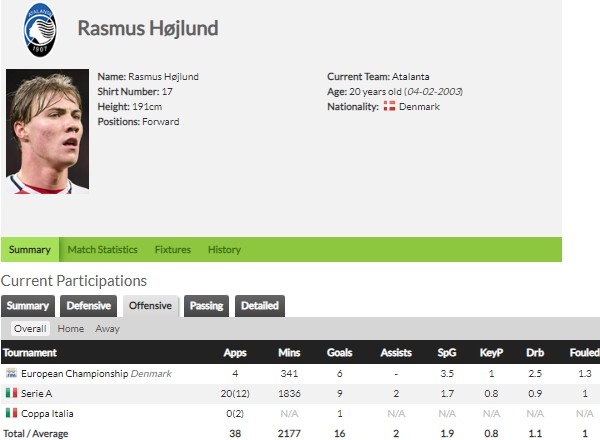 2年前,18岁的霍伊伦在丹麦联赛15场打入0球。转投奥地利联赛后打开进球账户,让他获得前往意甲亚特兰大效力的机会。