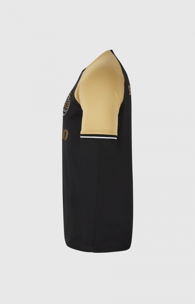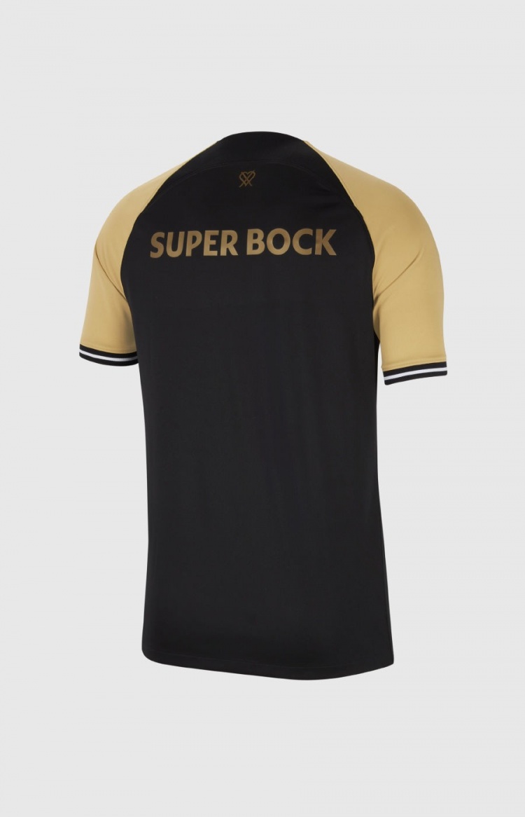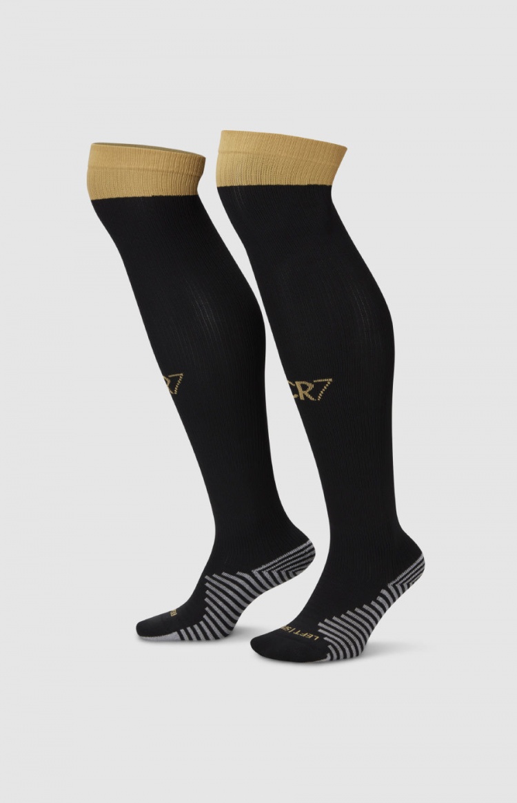 这套球衣主体为黑色,两个衣袖和球衣上的Logo均为金黄色,胸前除了赞助商和葡萄牙体育队徽之外,还有CR7标识。搭配的球裤和球袜也为黑金配色,同样印有CR7标识。