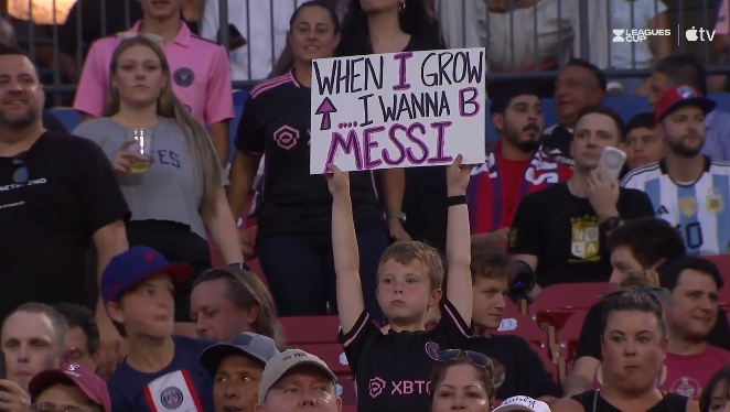 赛前有小球迷举着标语:当我长大后,我想成为梅西