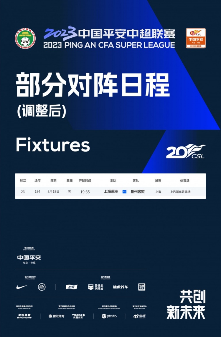 为备战亚冠联赛比赛,经上海海港足球俱乐部申请,协商梅州客家足球俱乐部、上海赛区同意,第23轮第184场上海海港对阵梅州客家比赛日期至8月18日。开球时间和场地不变。