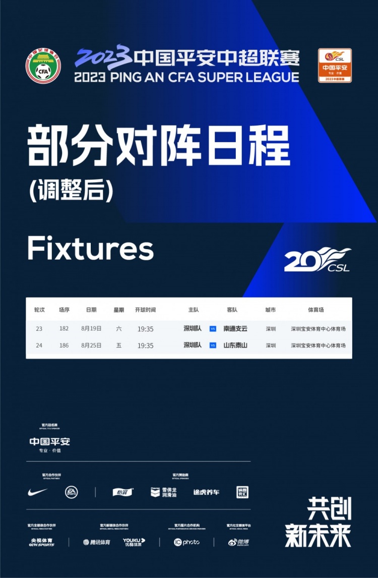 因赛区大型活动影响,经深圳赛区、深圳市足球俱乐部申请,协商相关俱乐部同意,2023中超联赛委员会研究决定,调整深圳队第23、24轮主场比赛场地。比赛日期和比赛时间不变。