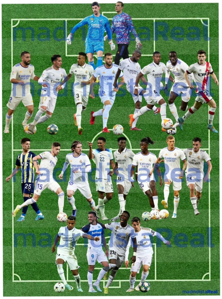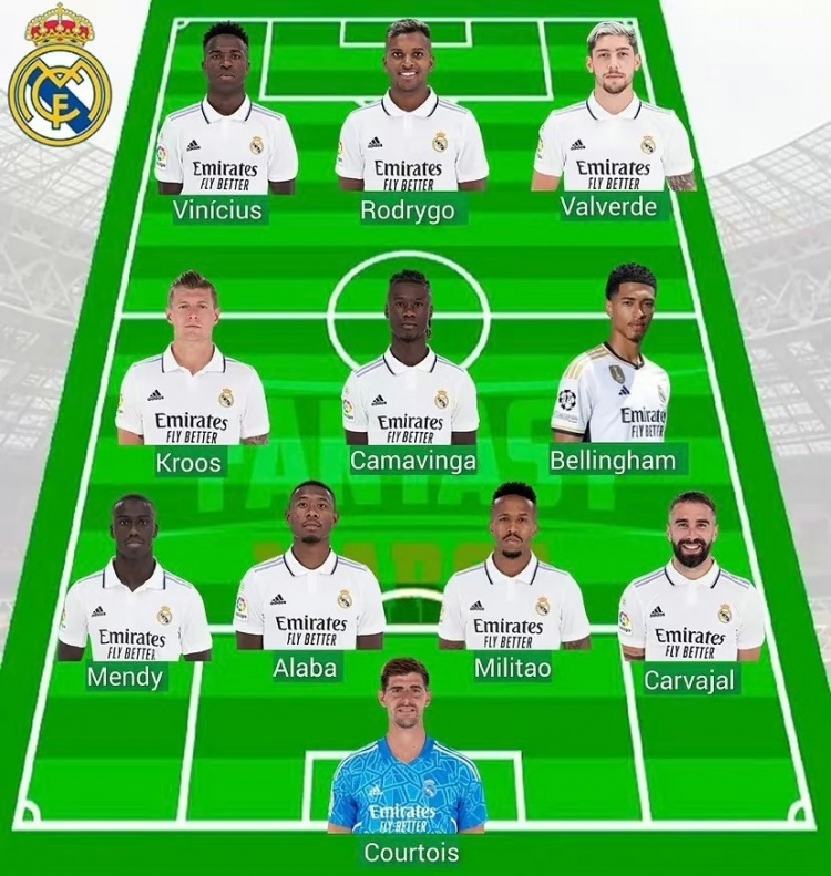 在这套阵型中,阿拉巴和米利唐出任主力中卫,门迪(不受伤的情况下)和卡瓦哈尔分别出任左右两边后卫。在中场, 由卡马温加出任防守型中场,他的左侧是克罗斯,右侧是贝林厄姆。在前场,三名球员分别是维尼修斯、罗德里戈和巴尔韦德。