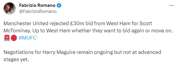罗马诺表示,曼联拒绝了西汉姆对麦克托米奈的3000万镑报价,现在情况要看西汉姆是会再次报价还是放弃。而马奎尔的谈判仍在进行中,但尚未进入后期阶段。