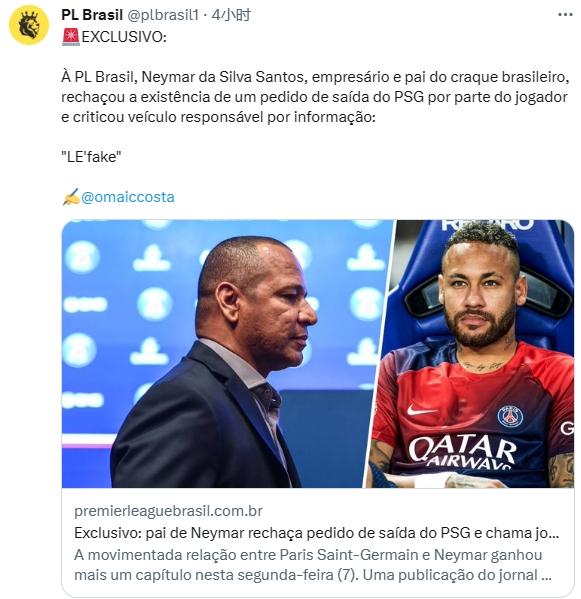 随后内马尔父亲告知巴媒PL Brasil:我无法确认一个没有发生的新闻报道,队报就是个假报(L'Equipe sendo L'Efake)。