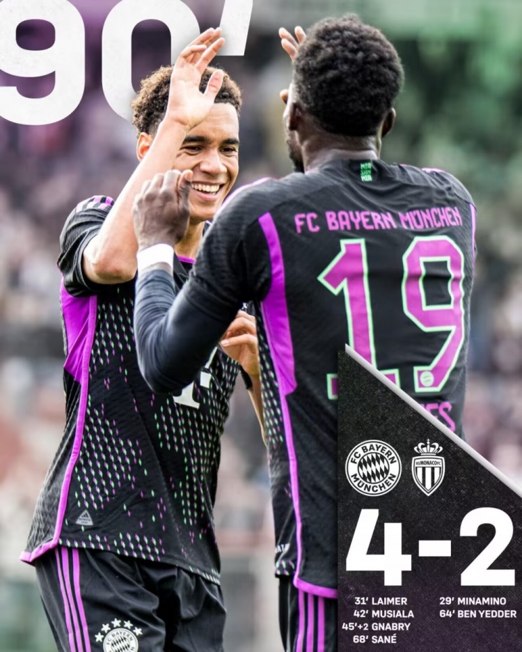 直播吧8月8日讯 北京时间8月7日晚23点整,2023年国际足球友谊赛展开角逐,拜仁慕尼黑对阵摩纳哥。上半场南野拓实首开纪录,莱默尔扳平比分,穆西亚拉1v3破门,格纳布里点射扩大比分,下半场特尔中柱,本-耶德尔点射扳回一城,萨内破门后中框。最终拜仁慕尼黑4-2战胜摩纳哥,拜仁友谊赛取得三连胜。