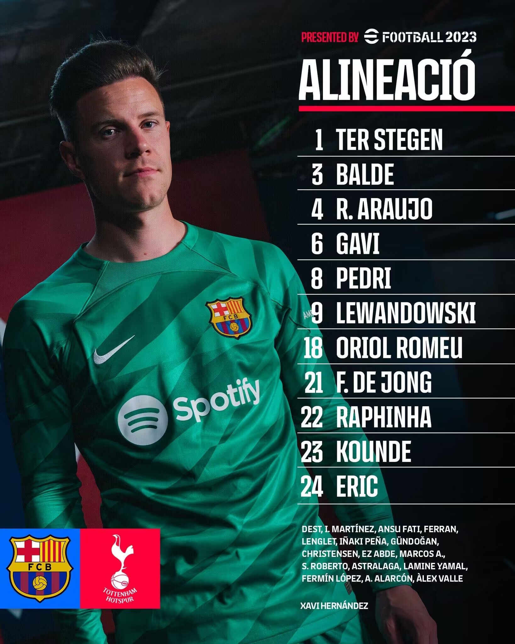 巴萨首发:1-特尔施特根、23-孔德、4-阿劳霍、24-埃里克-加西亚、3-巴尔德、18-罗梅乌、21-德容、6-加维、8-佩德里、22-拉菲尼亚、9-莱万