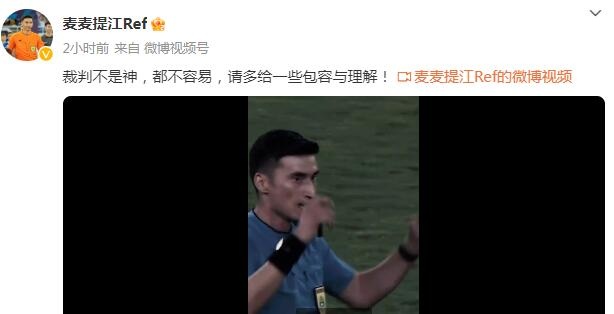 麦麦提江在社媒晒出了他吹响比赛终场哨声的视频并写道:“裁判不是神,都不容易,请多给一些包容与理解!”