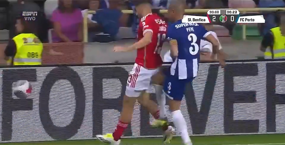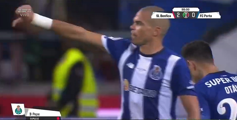 比赛第90分钟,本菲卡球员用身体护住皮球,佩佩在身后用膝盖顶向对方的臀部,主裁判看过VAR后向他出示红牌。