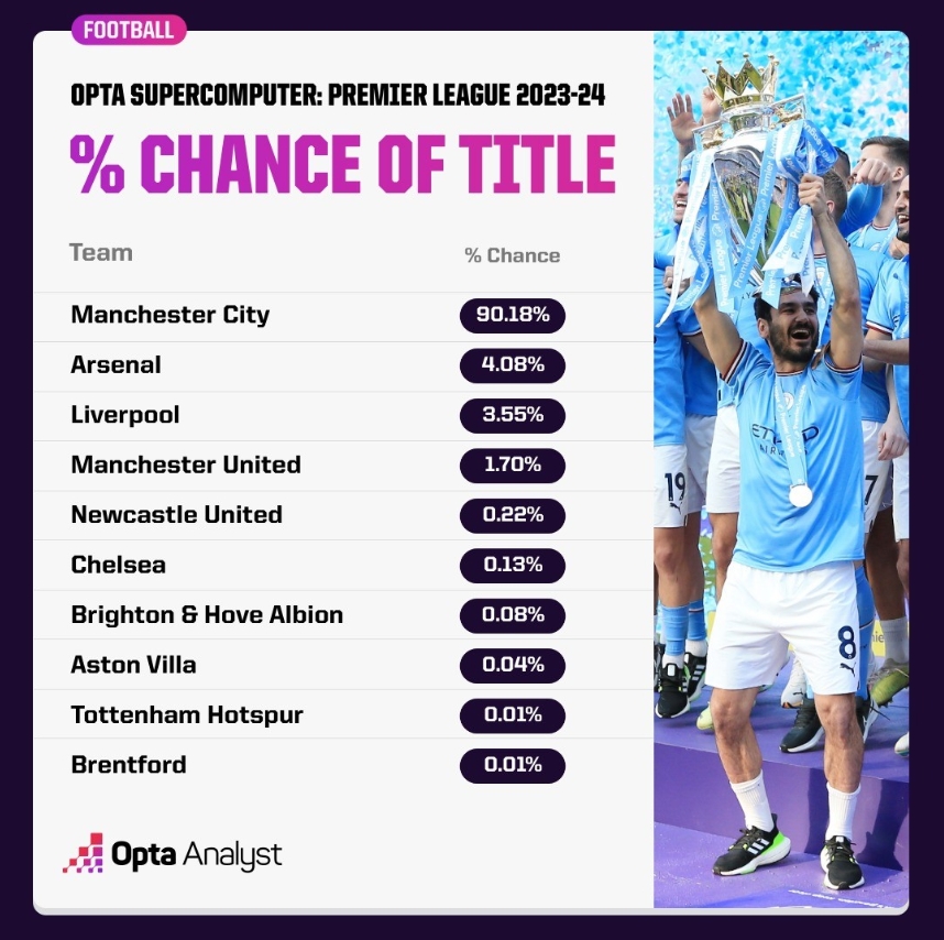 数据机构Opta用超级计算机模拟了2023-24赛季英超联赛10000次,最终得出了各队的夺冠概率,曼城以90.18%的概率遥遥领先。