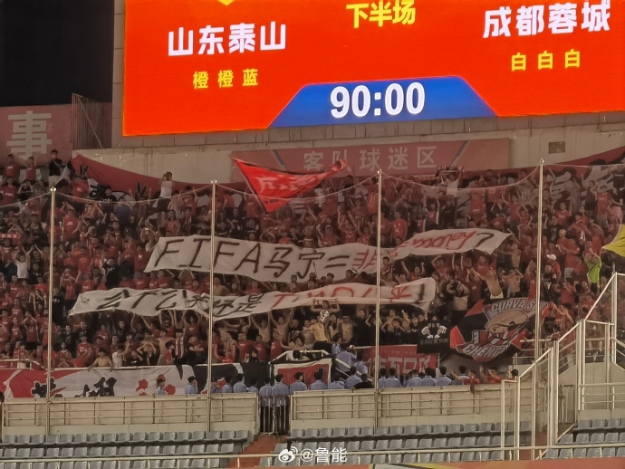 中超第21轮,山东泰山主场0-1不敌成都蓉城。成都蓉城球迷因不满主裁马宁在蓉城对青岛比赛中的判罚,在看台打出标语:FIFA马宁=非法money?公平公平还是XXX的公平!