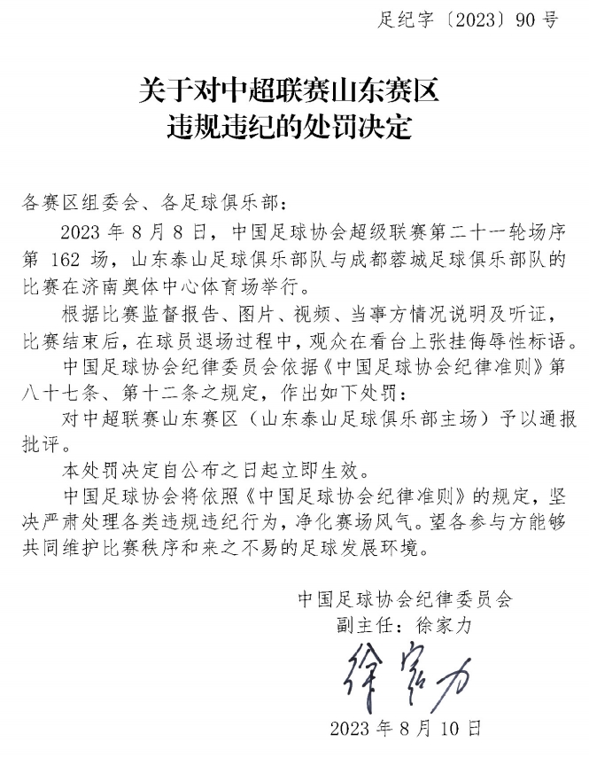 直播吧8月12日讯 足协官方今日公布处罚决定,山东泰山主场观众张挂侮辱标语,予以山东赛区通报批评。