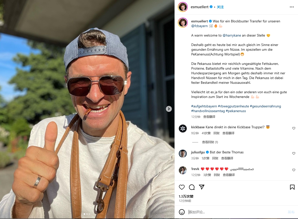 穆勒写道:对拜仁来说是多么轰动的转会🔥,热烈欢迎凯恩加盟🤝。