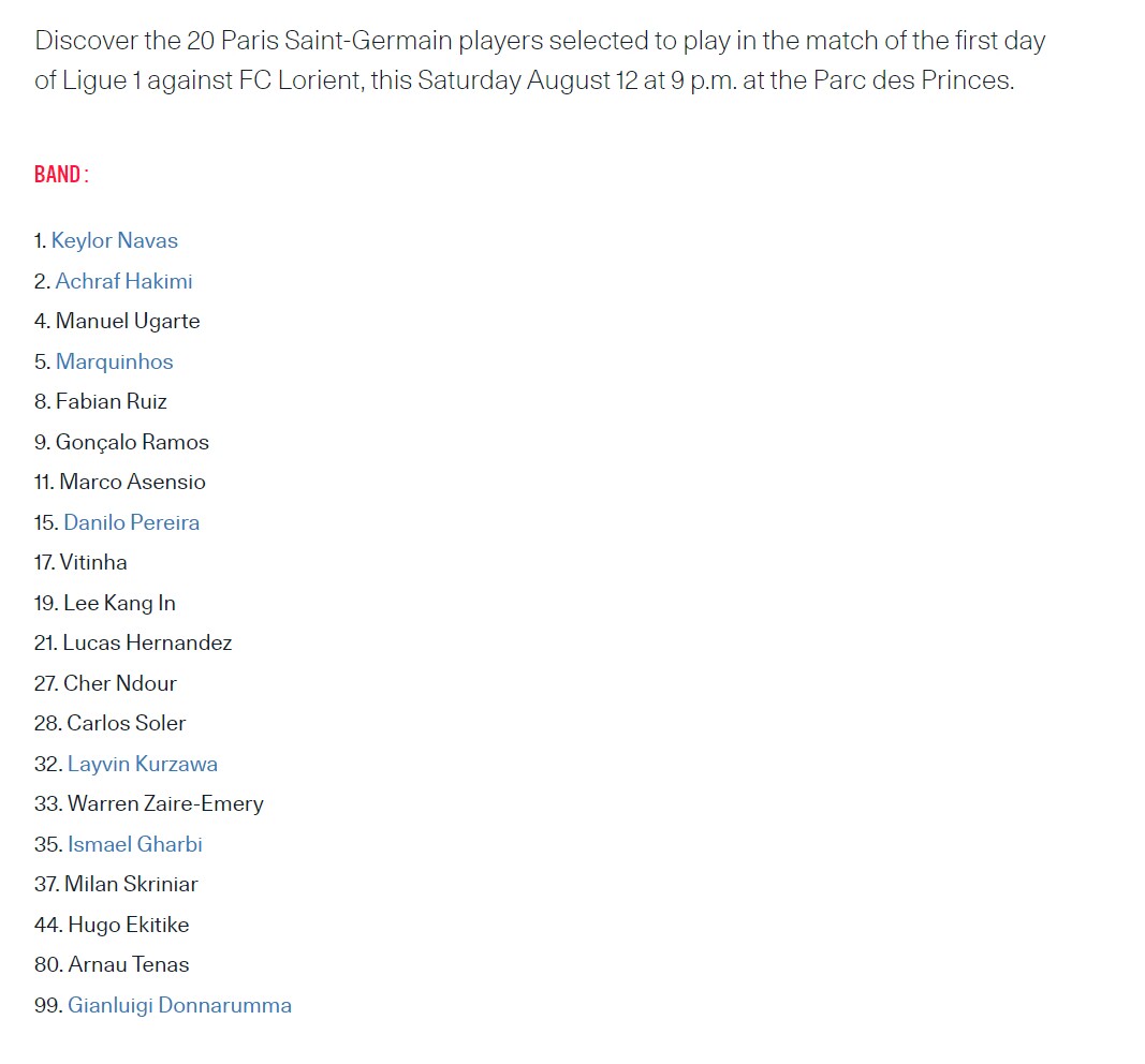 直播吧8月12日讯 巴黎大名单公布法甲首轮的大名单,其中姆巴佩、内马尔、维拉蒂缺席。8月13日03:00,法甲第1轮,巴黎圣日耳曼将在主场迎战洛里昂。