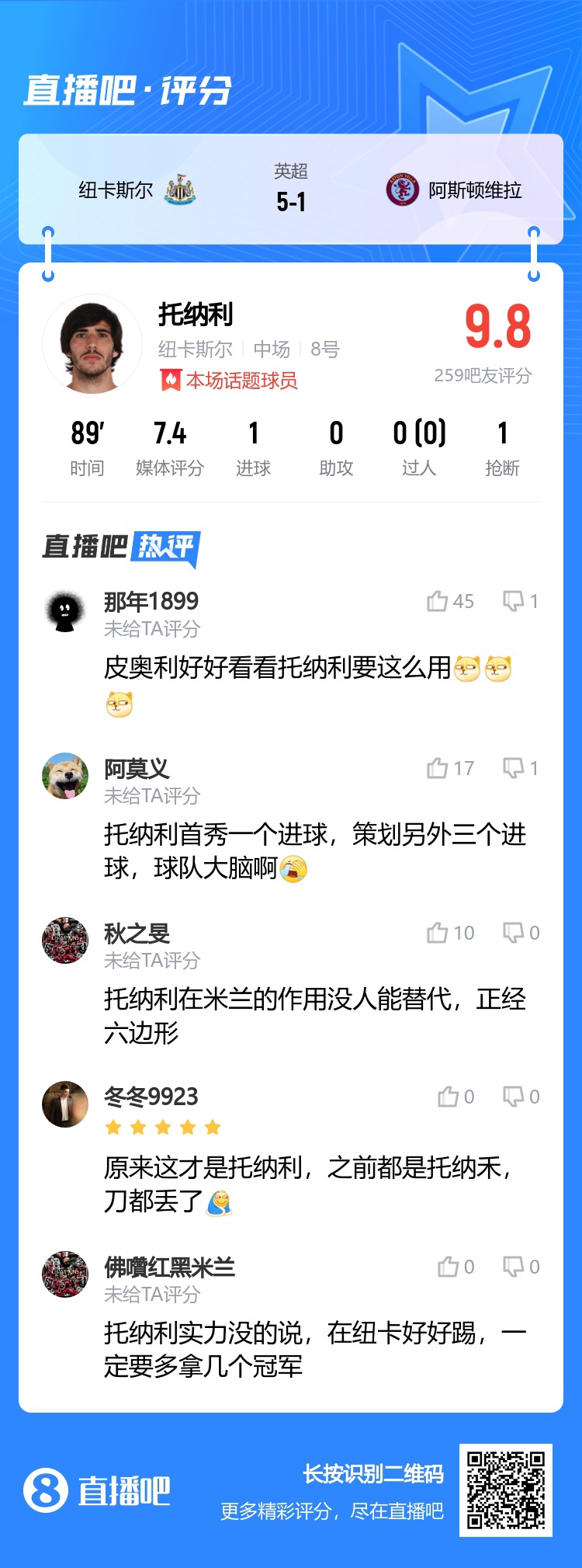 英超首轮纽卡5-1大胜维拉,托纳利开场6分钟破门并且两度策动进球。