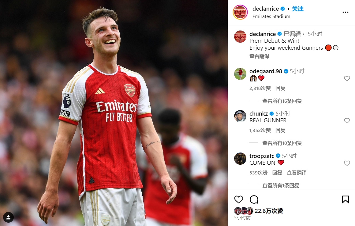 赖斯写道:枪手生涯英超首秀&首胜!枪迷们享受你们的周末吧🔴⚪️