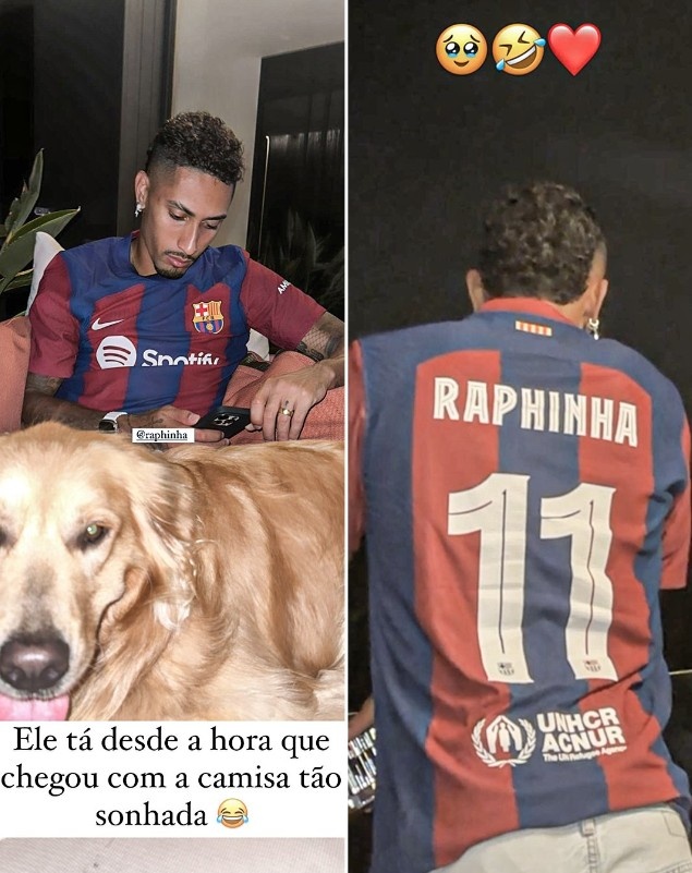 直播吧8月13日讯 巴萨边锋拉菲尼亚的妻子Natalia更新社媒动态,晒出了拉菲尼亚在家里身穿巴萨11号新球衣的照片。