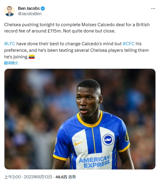 该记者表示,切尔西正力争以创英国转会费纪录的1.15亿英镑签下布莱顿中场凯塞多,交易尚未完成但已经接近敲定。