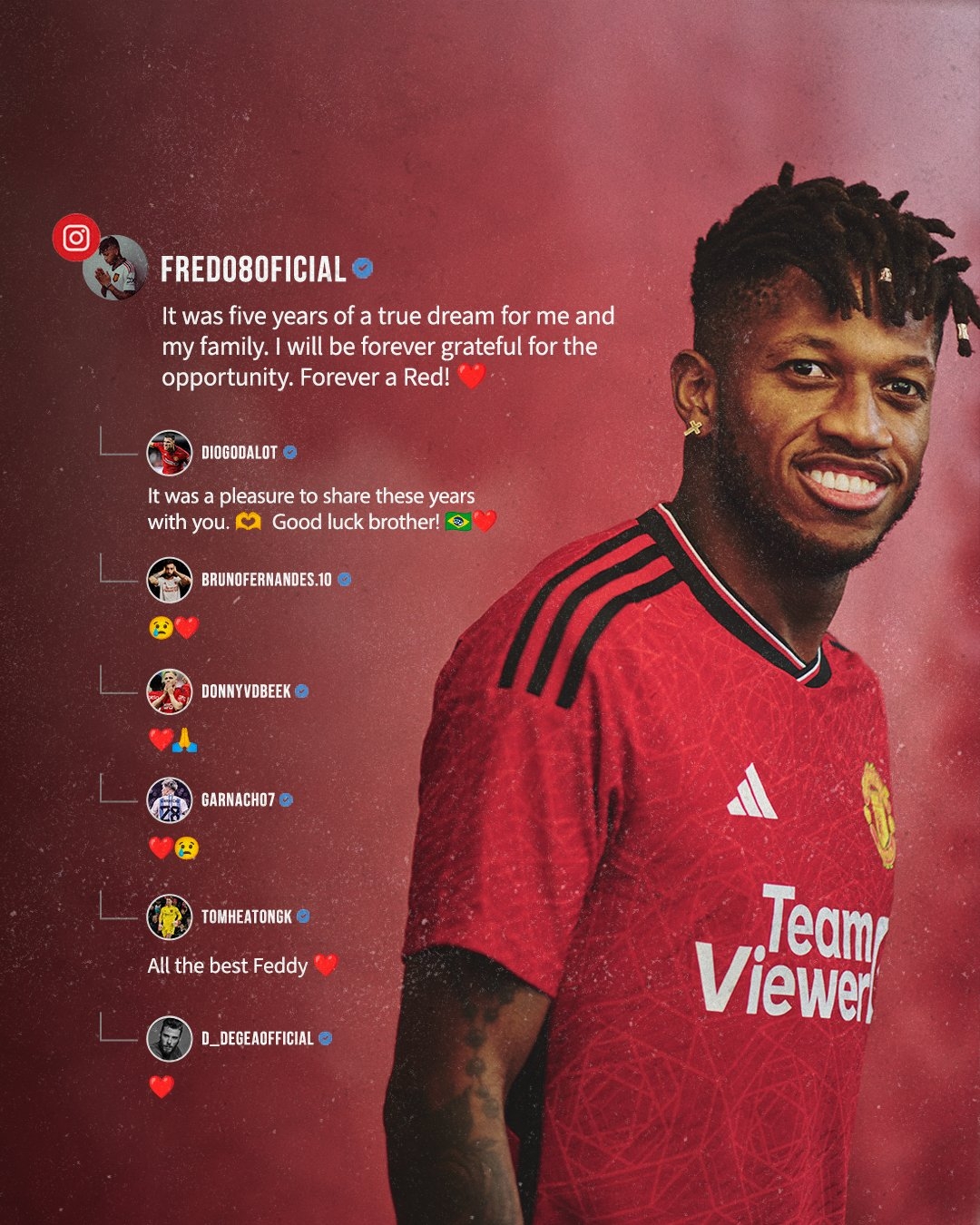 曼联写道:“足球世界中最友善的人之一❤️,未来请多珍重@弗雷德。”