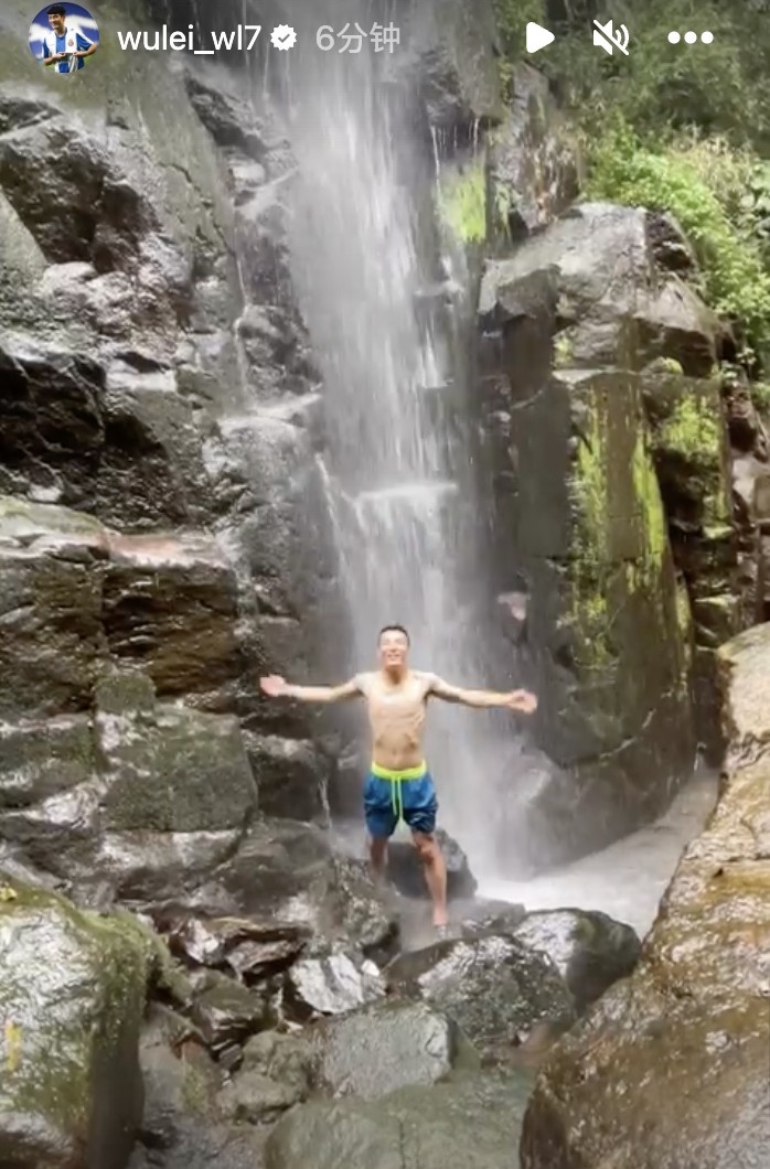 直播吧8月14日讯 武磊更新社交媒体,晒出了外出游玩在瀑布下冲凉的动态。