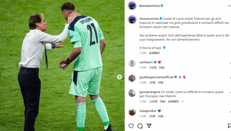 多纳鲁马更新了社媒动态,祝福了曼奇尼:“衷心感谢曼奇尼先生在国家队度过的时光,我们与你一起度过了巨大的欢喜以及艰难的成长时刻。