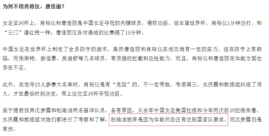 中国女足小组出局后,足球报曾经发布过一篇“解密”文章,里面提到赵瑜洁的落选原因:体能状态没有达到国家队要求。